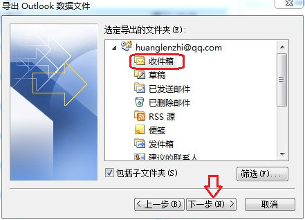 5. 弹出“导出 Outlook 数据文件”窗口,在右侧“选定导出文件夹”列表中选择”收件箱”,然后点击”下一步”。