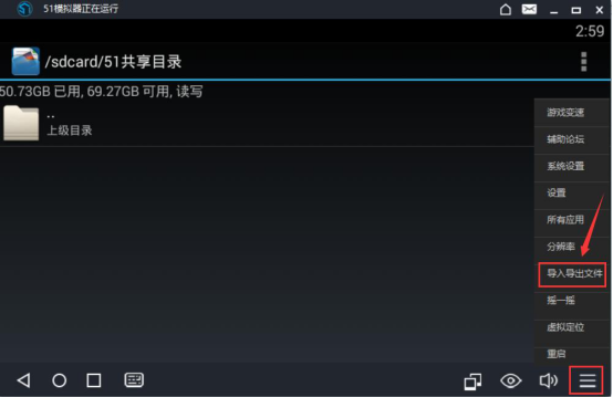 5. 如果不含有游戏安装包,就点击 51 模拟器界面右下方的“≡”菜单按钮,并从它弹出来的菜单项中点击“导入导出文件”。