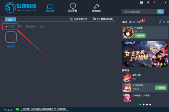 1. 首先,我们将电脑中的 51 模拟器打开。当安装不了游戏的时候,我们先点击界面左上方的“劲风版”,看看模拟器能不能正常启动。