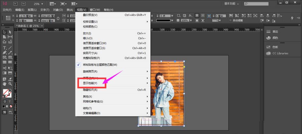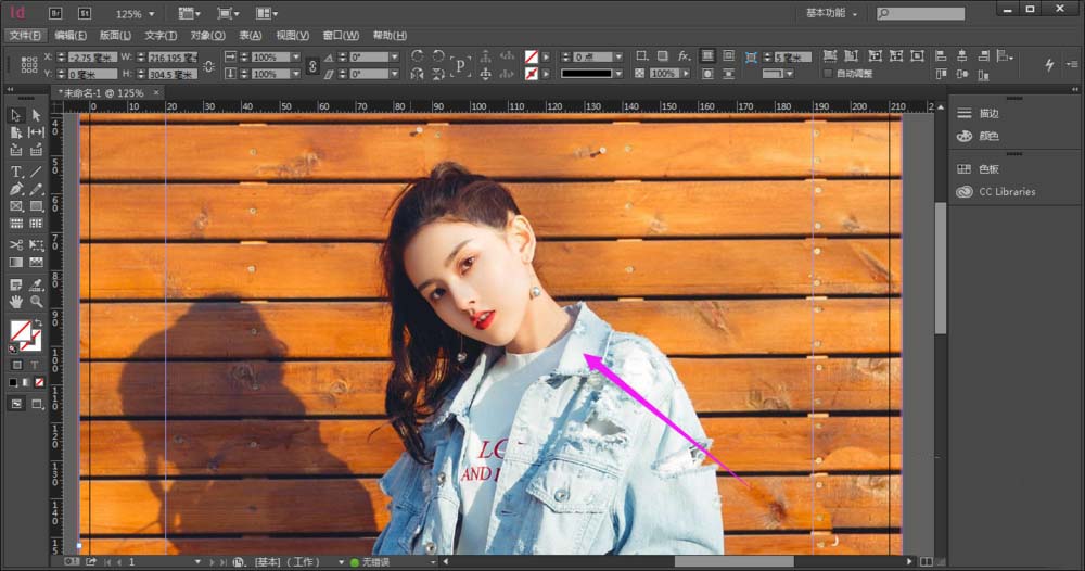 打开 Adobe InDesign CC,进入界面,在菜单栏中点击”文件”——”置入”,在画布中插入一张高清图片,