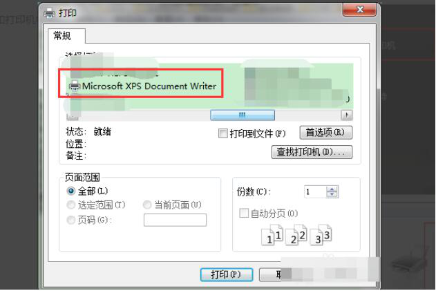 5. 弹出的“打印”窗口,在常规一栏中选择名为“Microsoft XPS Document Writer”的打印机选项,然后点击右下方“打印““打印”,这样 XPS 文件就可以打印了。