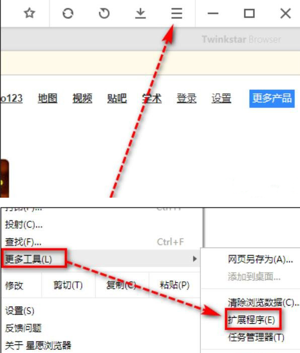 3. 安装完成后,在星愿浏览器界面的上方,点击“更多”的功能图标。在它的子菜单中点击“扩展程序”,从而进入星愿浏览器加速下载的下一步操作。