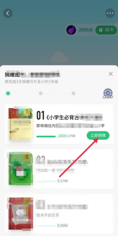 进入以下界面,如图,点击右上方的【捐书】,然后点击【立即捐赠】,就可以向学校捐赠书籍。