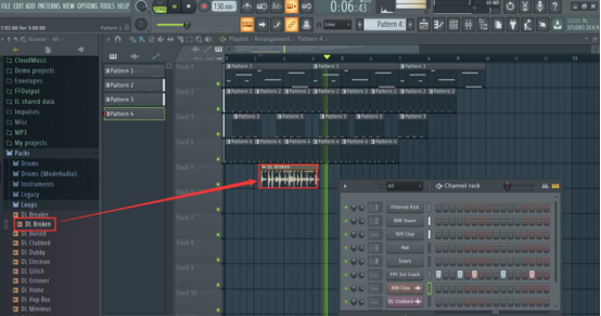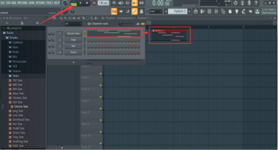 6. 在 FL Studio 的界面上方,选择新建“Pattern2”。接着,我们在左侧的鼓组音效列表中,找到适合自己的效果,将它拖放至通道机架。在将之前复制的音符全部粘贴在播放列表的音效下方。