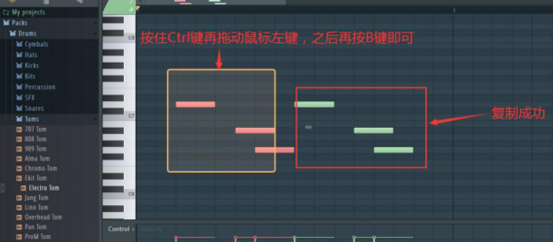 4. 接下来,我们按住鼠标左键并按住Ctrl键将上一步设置好的音符全部选中,再按一下B键,就能将自己做好的音符进行复制了。