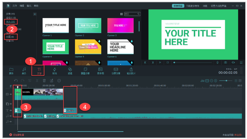 4. 点击“文字”,为图片添加字幕条,还可以制作片头. 片尾,更具大片感。(提示:以下所有添加操作都是把项目拖拽到时间轴生效)。