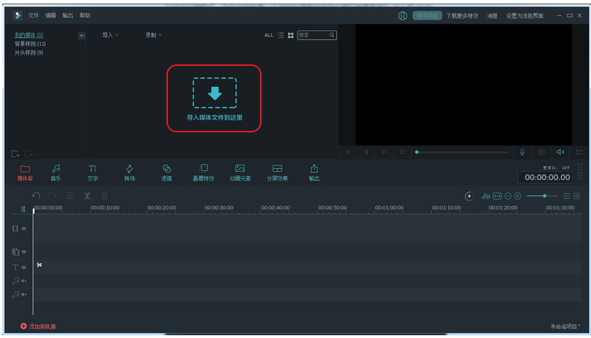 1. 打开万兴神剪手,进入主页面,点击”文件”按钮,选择“导入多媒体文件”,导入照片,你也可以直接将图片拖拽到主界面中。