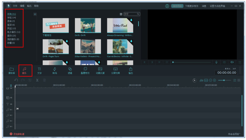 2. 点击图片中间的“+”,把图片添加进轨道。点击“音乐”添加背景音乐,建议选择“年轻”和“柔和”这两个类别。