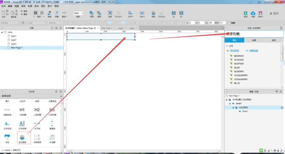 进入这个动态面板,再拖入一个动态面板并进行命名,用于输入滚动的文字,