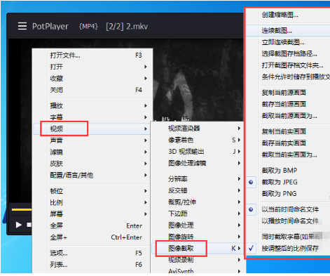 2. 拖动视频进度条到想要截取的画面(记得暂停播放),接着在视频画面上点击鼠标右键,在弹出的选项中依次打开“视频”—“图像截取”,如下图所示: