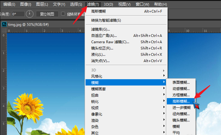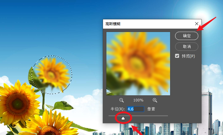 点击椭圆选框工具,然后框选需要处理的图片区域,在 PS 菜单栏点击”滤镜”->”模糊”->”高斯模糊”选项,弹出窗口,调整半径像素,设置模糊效果,点击确定