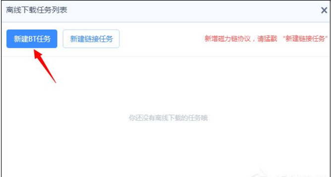 2. 在离线下载界面,我们可以看到“新建 BT 任务”,这里就是下载 BT 种子文件的地方了,开始建立下载任务吧