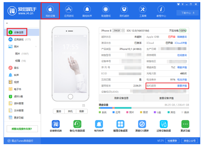 打开爱思助手,在“我的设备” -> “验机报告”,显示“验机功能已暂停”。