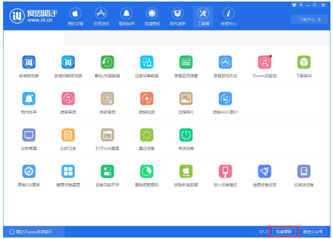 遇到这种情况,我们要先检查爱思助手是否为最新版,点击软件下方的“检查更新”,更新到最新版之后,再查看验机报告。