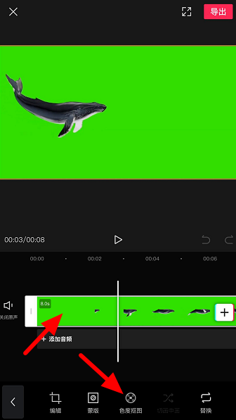 素材添加成功,进入剪辑窗口,点击视频轨道,左滑工具栏,选择“色度抠图”