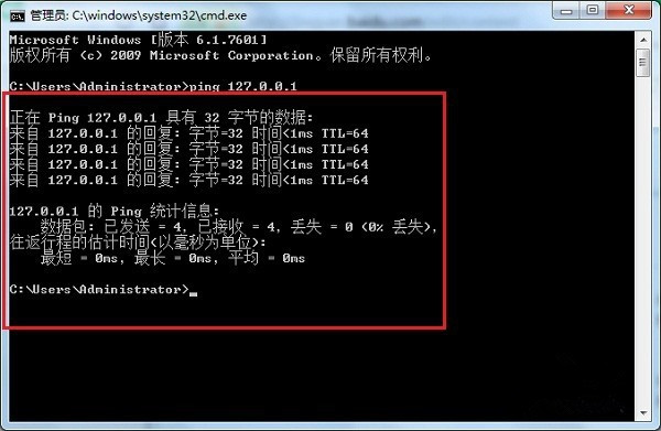 点击确定,进去命令提示符窗口,输入“ping 127.0.0.1”,如图,