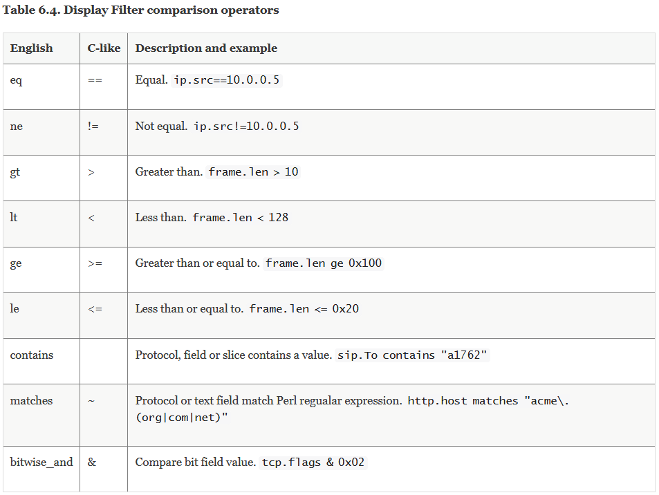 过滤关系:过滤关系就是大于. 小于. 等于这三种关系,你可以直接查看官方给出的表,注意,“English”和“C-like”这两种写法在 Wireshark 中是等价的,都是可用的。