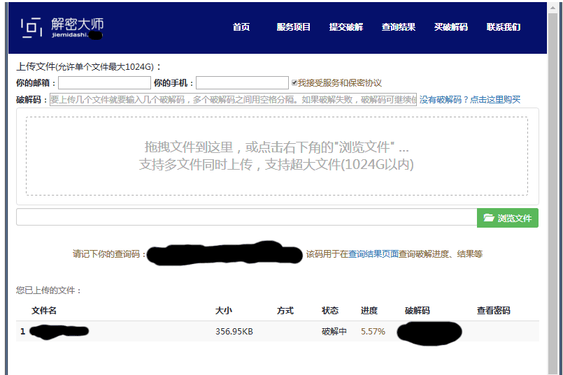 上传文件之后,平台即可自动破解文件密码,你可以去做其他事情;记住查询码,你可以随时查看破解进度和结果,解密成功,你会收到短信或者邮件通知。