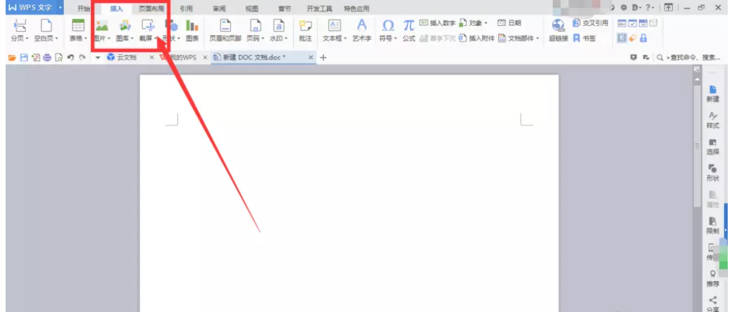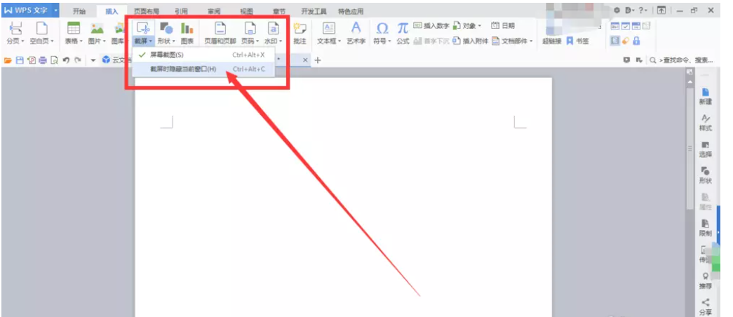 新建一个 WPS 文档,进入界面,在上方菜单栏点击“插入”——“截屏”功能,