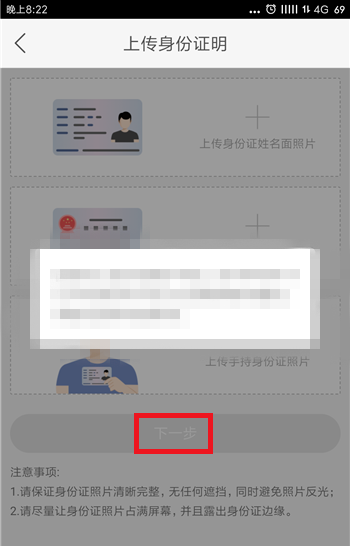 根据要求,上传我们的身份证照片,然后点击“下一步”,按照要求即可完成实名认证。