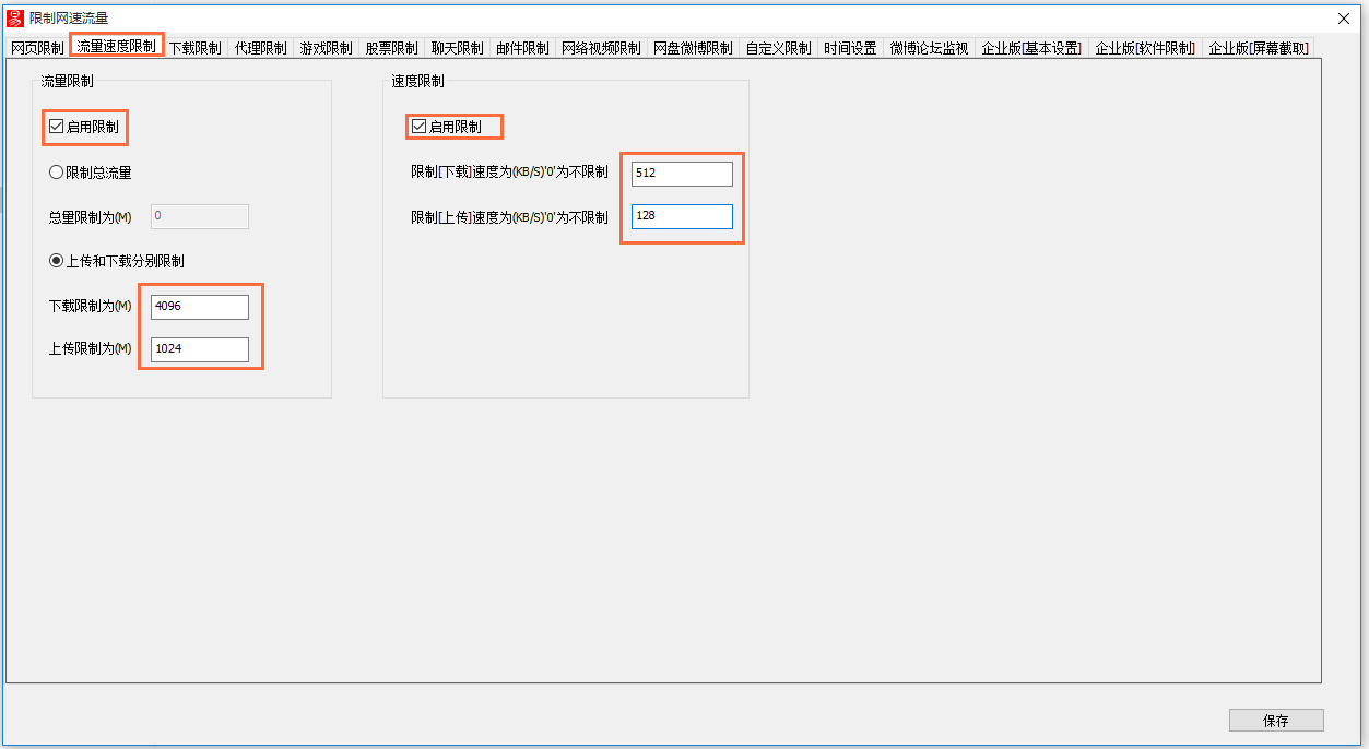 选中限制网速流量策略,点击“编辑”,如图,切换到“流量速度限制”,勾选“启用限制”,分别设置流量限制和速度限制,然后点击保存,