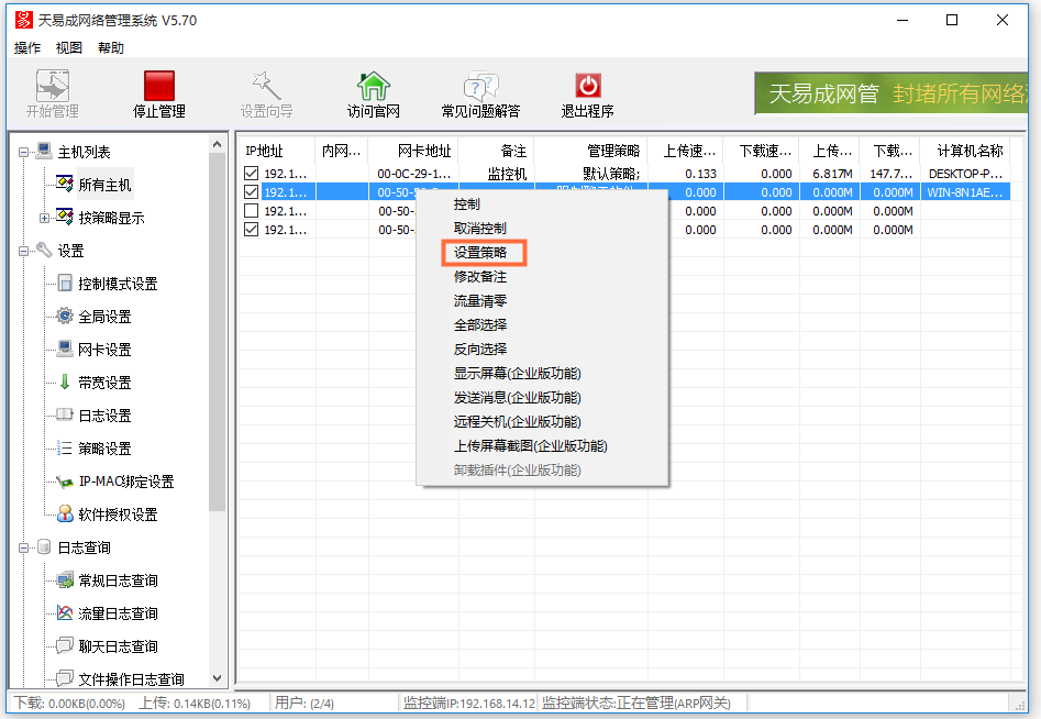 回到软件主界面,点击“主机列表”->“所有主机”,选择目标电脑,鼠标右击,弹出菜单,开始“设置策略”,