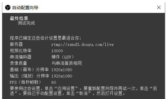 现在进行自动测试,测试完成,显示结果,如图,点击“应用设置”即可,