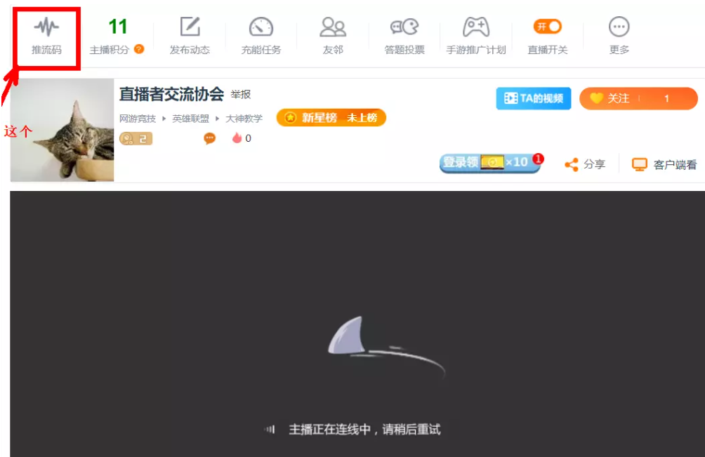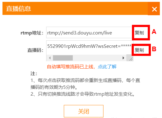 如图,进入直播间,点击上方“推流码”,依次复制 rtmp 地址和直播码,