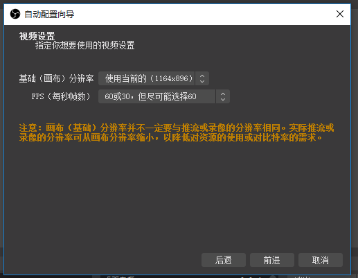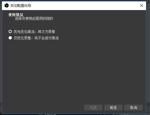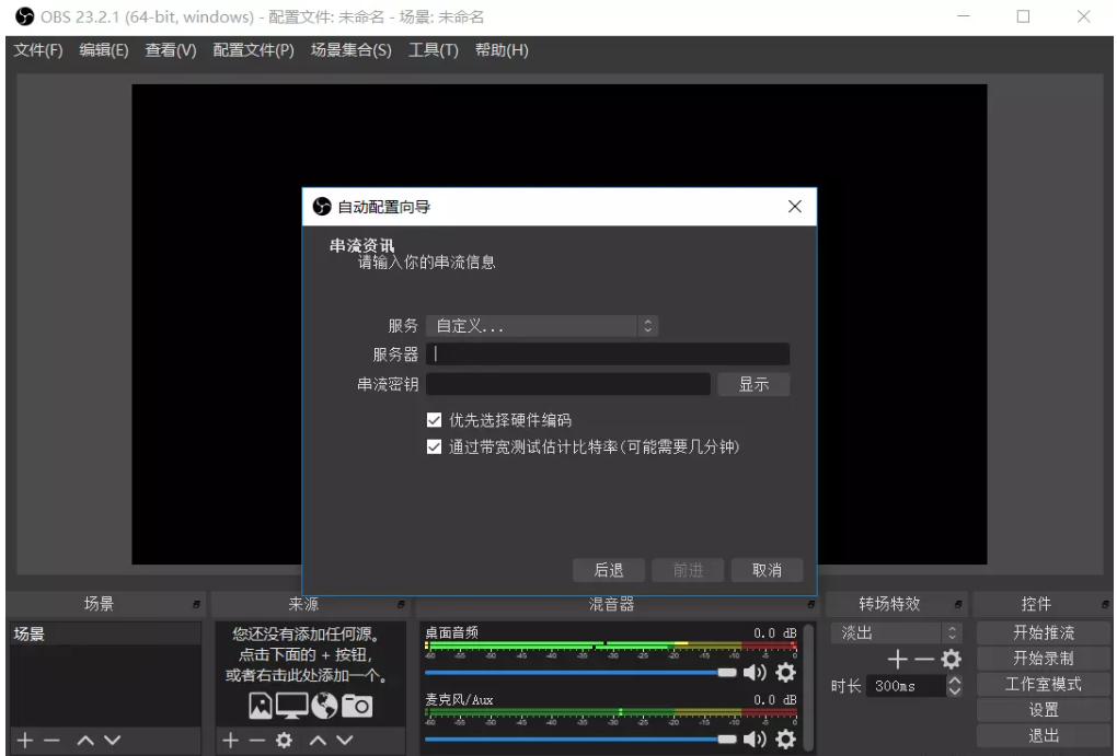 打开 OBS Studio 软件,进入界面,如图,点击上方“工具” -> “自动配置向导”,弹出窗口,想要进行直播推流,需要在这里进行设置,