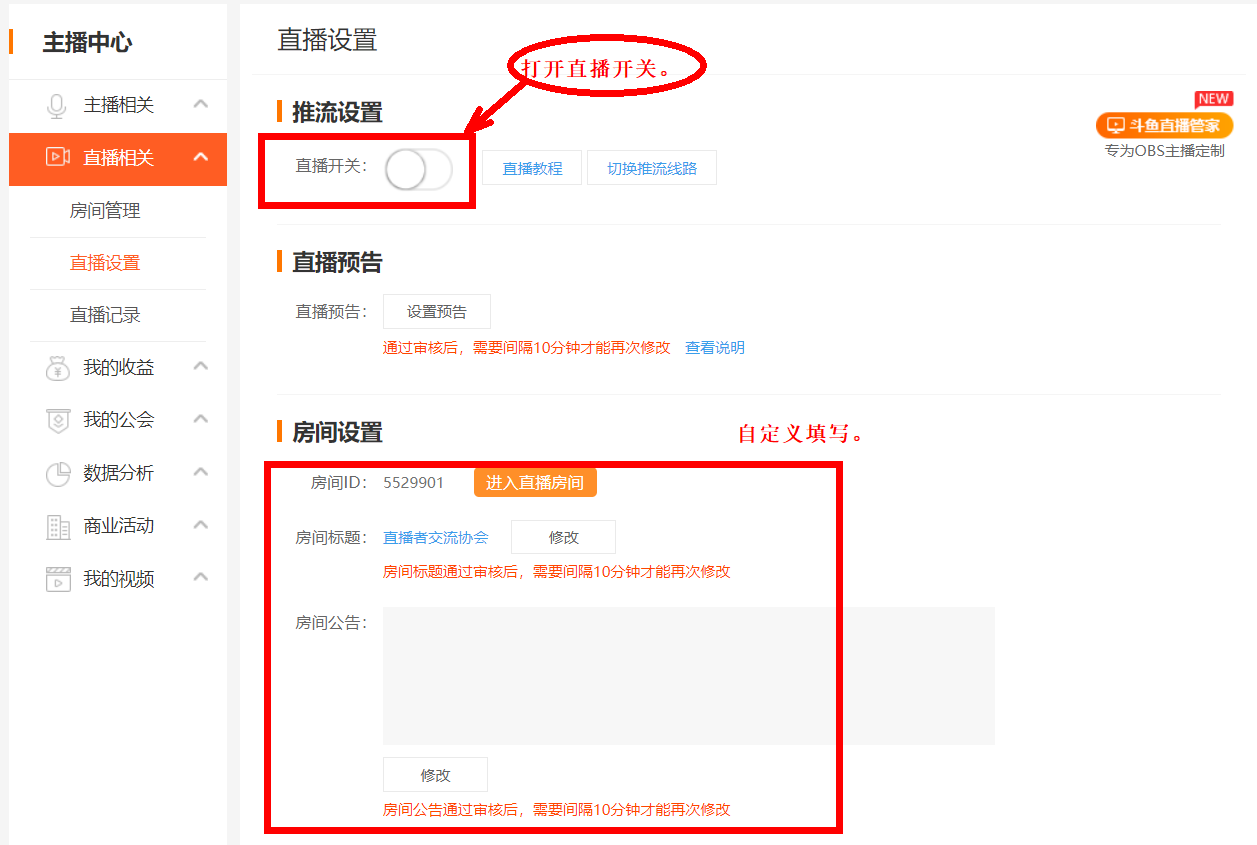 进入直播设置界面,如图,打开直播开关,进行“房间设置”,填写房间标题、房间公告,