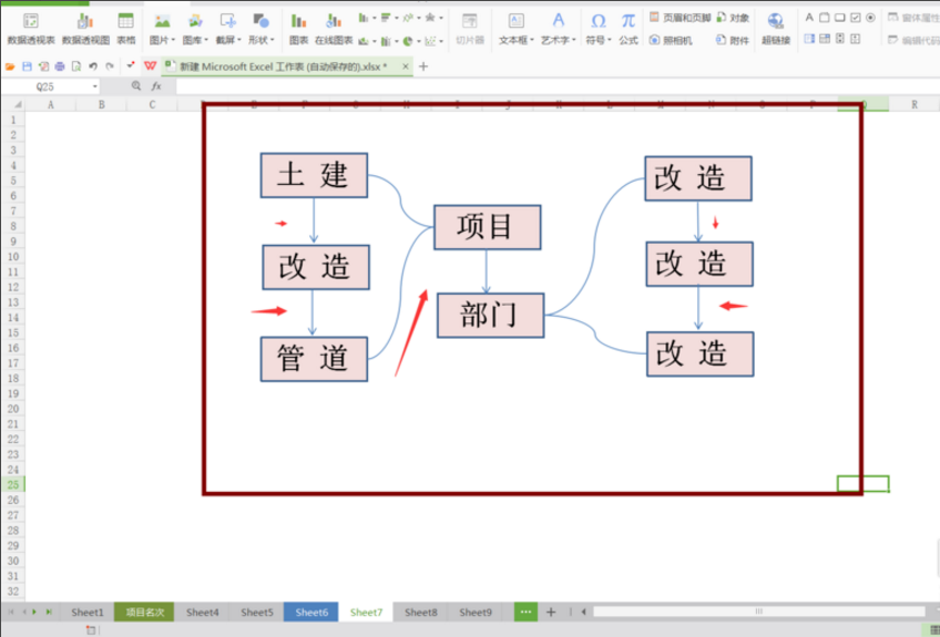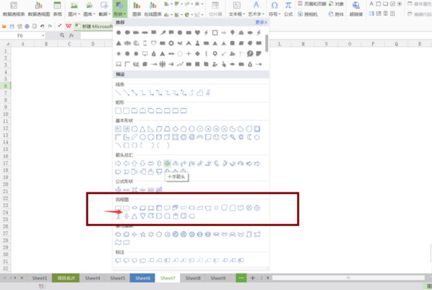 7. 接着需要给流程图添加箭头或者其他的连接符,打开形状,选择合适的符号,添加到工作表当中来。