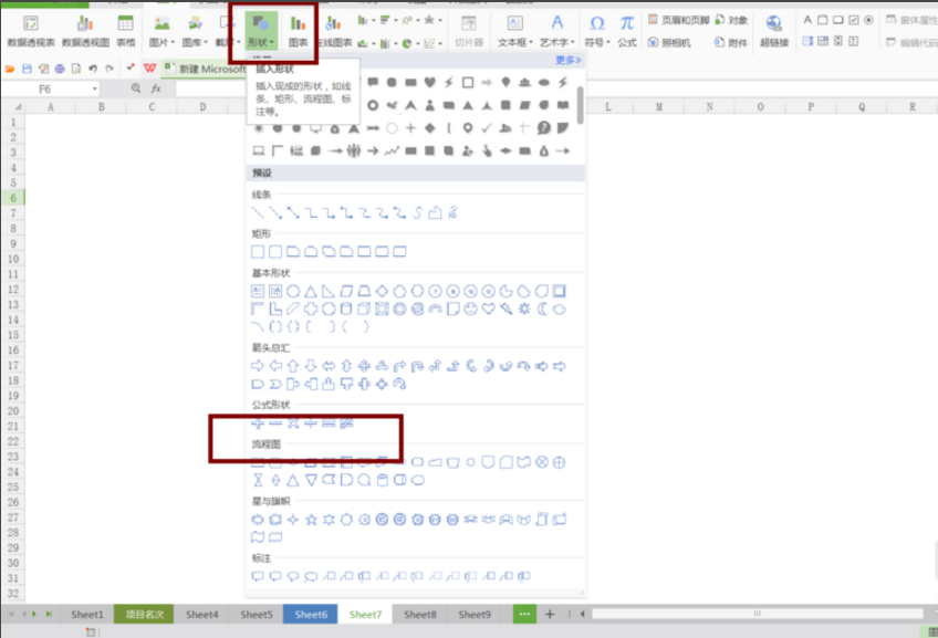2. 在子菜单中点击形状,弹出的众多形状中选择流程图。