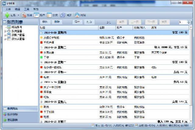 软件着重从功能. 软件易用性. 趣味性方面为用户展示全新的理财体验,首创桌面记账软件和记账网站相结合,可以双向同步数据,真正做到记账数据永不丢失。软件界面简洁,使用方便,可随时记录. 查看收支明细,即时了解每笔记录明细。您还可以得到各种账目汇总报表,多样化的统计报表. 统计图表方便您分析各个时段的收入和支出情况,充分挖掘数字背后的秘密。