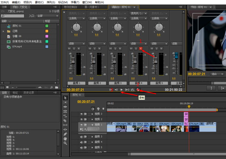 设置完成,根据图示步骤进行录音,先单击R键,然后点击“录制”,录制完成,播放试听效果。