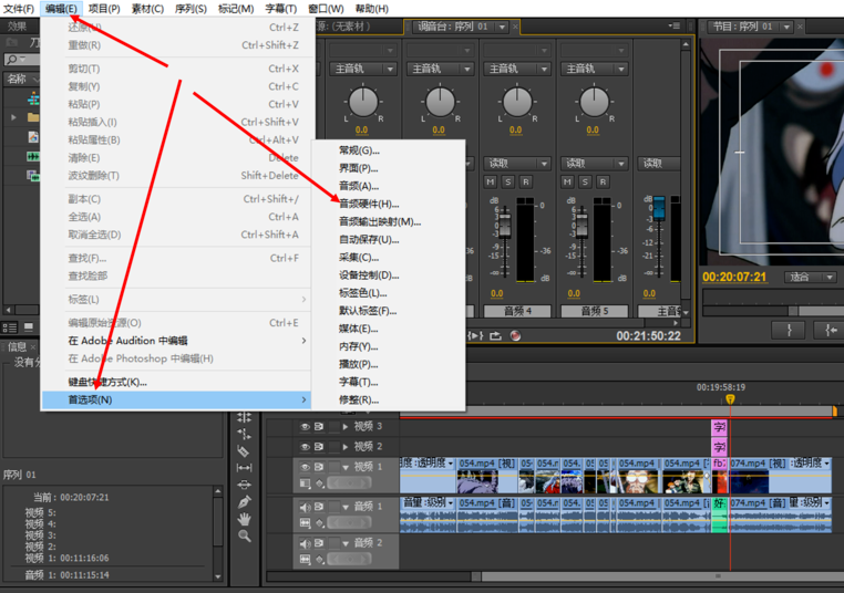 这是因为 Premiere 不知道录音设备在哪里,我们需要进行设置,如图,点击菜单栏的“编辑” -> “首选项” -> “音频硬件”,