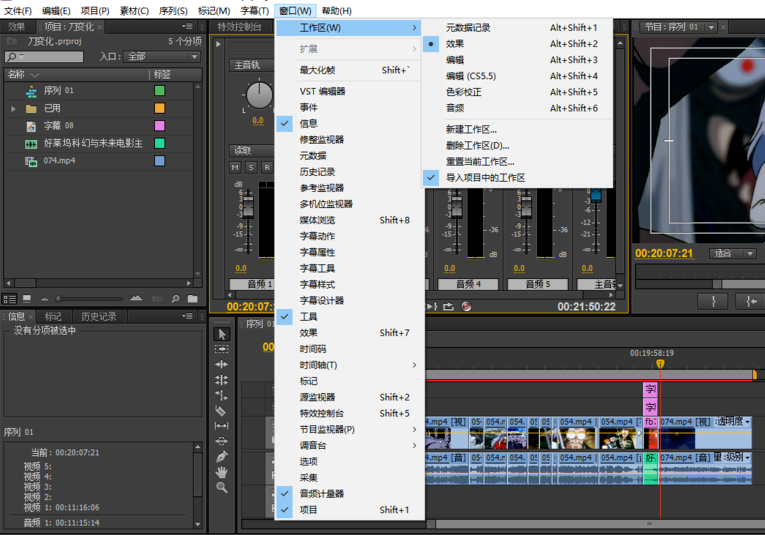 打开 Premiere 软件,导入视频,点击菜单栏的“窗口” -> “工作区” -> “效果”按钮,或者直接按快捷键“Alt + Shift + 2”,