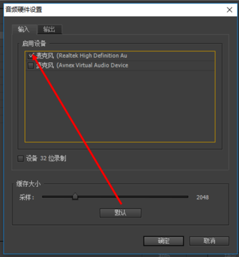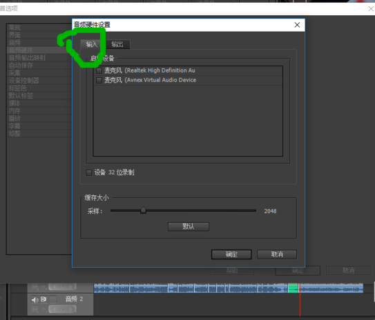 弹出音频硬件设置界面,点击“输入”,勾选需要启用的录音设备,点击确定,如图,