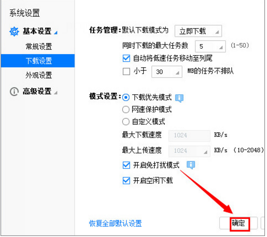 3. 在下载设置右侧找到“开启免打扰模式”,将其勾选然后点击“确定”即可。