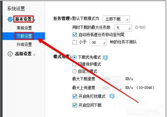 2. 在设置中打开“基本设置”->“下载设置”。