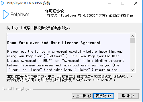 一. 在本站下载最新版的 PotPlayer 软件安装包,双击运行,如下图,可以选择软件的语言。