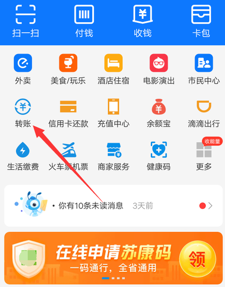 打开手机支付宝,进入首页,点击“转账”,