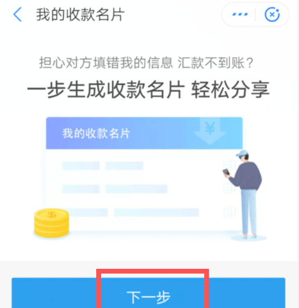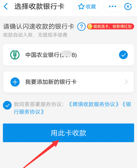 这里选择“闪速收款”,一步生成收款名片,点击下一步,选择收款银行卡,根据提示操作即可。