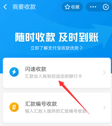 跳转至以下界面,你可以点击“闪速收款”或者“汇款编号收款”,