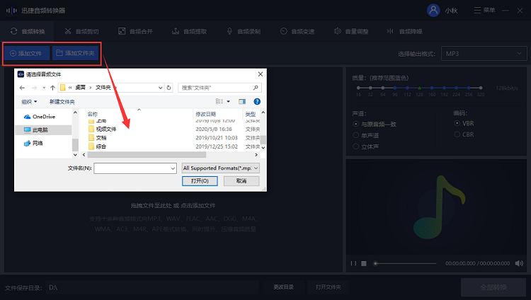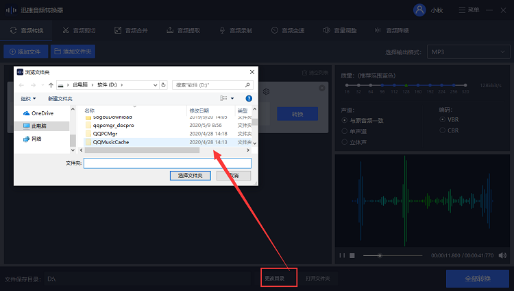 现在设置文件保存路径,如图,点击下方“更改目录”,弹出对话框,选择音频文件导出保存位置,