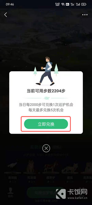 可通过支付宝运动获取的步数来兑换巡护机会,每次兑换消耗 2000 步数,每日对多可兑换 5 次。
