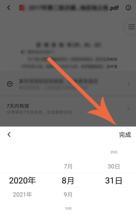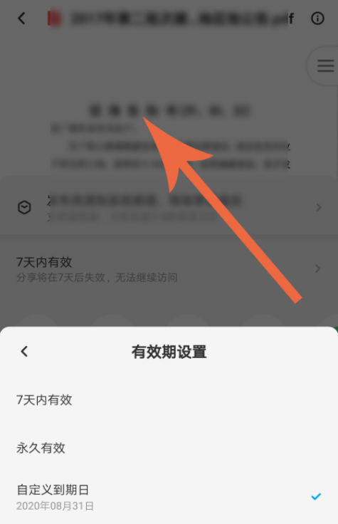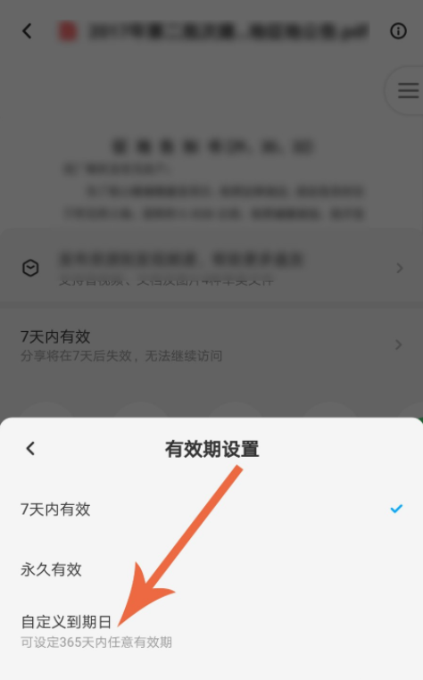 底部弹出菜单选项,点击“7 天内有效”,进入有效期设置界面,如图,点击“自定义到期日”,