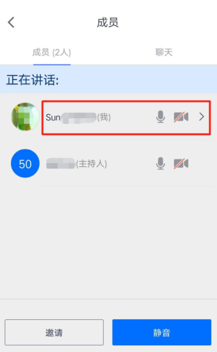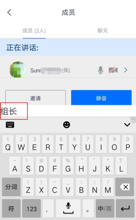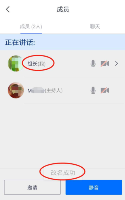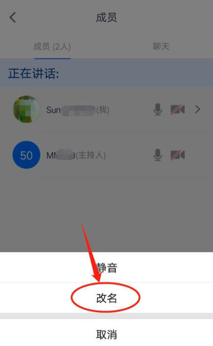 进入成员界面,在会议成员列表中点击自己的名字,底部出现弹框,点击“改名”,