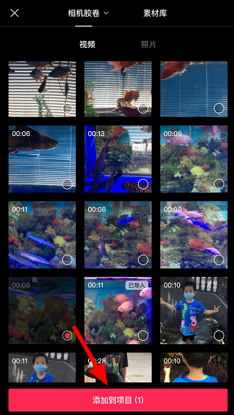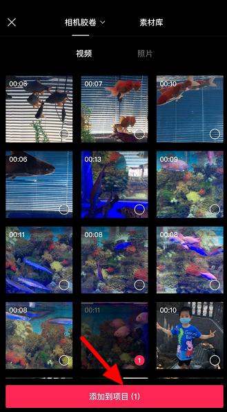 再次进入相册,勾选一个视频,点击“添加到项目”,