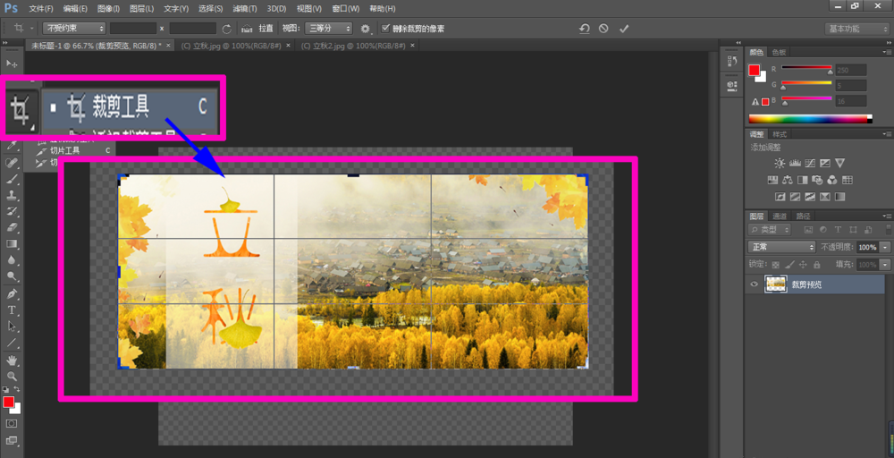 在工具栏中选择裁剪工具,裁剪多余的区域,如图,