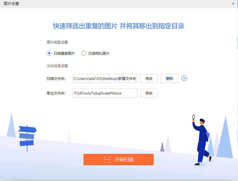 3. 点击“移出文件夹”,选择筛选结束之后存放照片的位置,然后点击“开始扫描”,耐心等待,